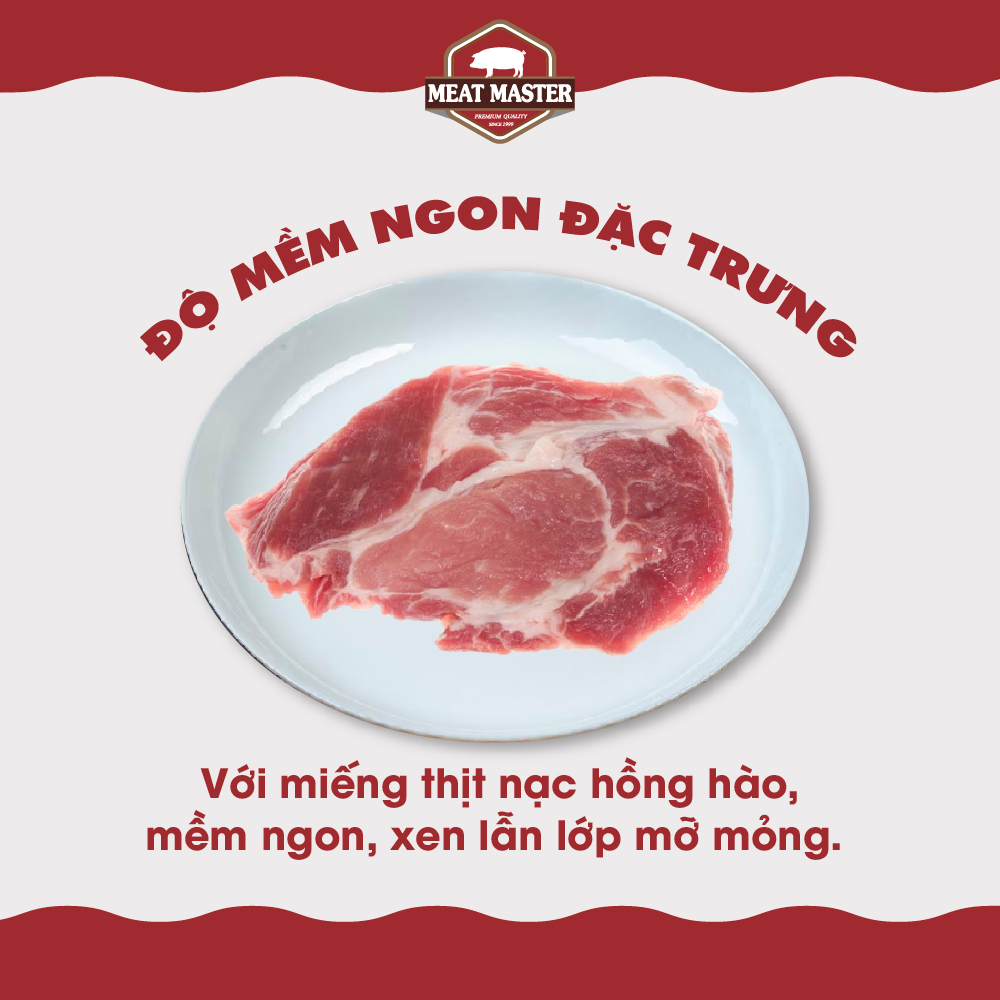 Thịt vai Meat Master là phần thịt nằm ở khúc giữa cổ và vai heo. Đây là phần thịt heo rất ngon vì có tỷ lệ nạc mỡ cân bằng hòa lẫn vào nhau, không quá khô mà cũng không ngấy mỡ.