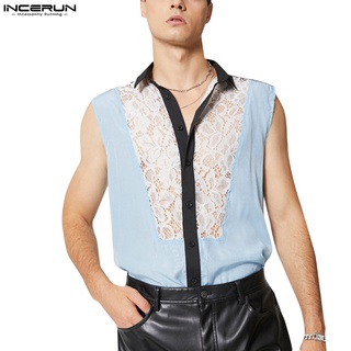 INCERUN Áo Sơ Mi Tay Dài Giả Hai Lớp Phối Ren Thời Trang Cho Nam