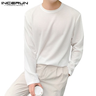 Áo thun INCERUN dáng rộng cổ tròn vải lưới xuyên thấu phối kim tuyến thời trang mùa thu cho nam