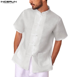 Áo sơ mi Incerun bằng cotton ngắn tay cổ đứng phối nút phong cách cổ trang Trung Hoa dành cho nam