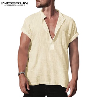 Áo sơ mi nam INCERUN tay ngắn cổ chữ V 4 màu trơn tùy chọn