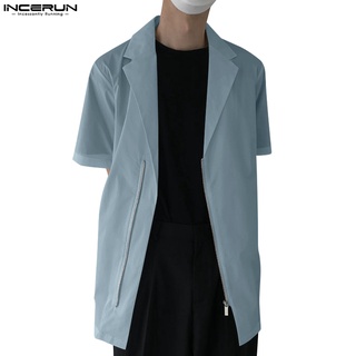 Áo sơ mi INCERUN tay ngắn màu trơn cổ bẻ phối khóa kéo thời trang mùa hè cho nam