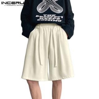 INCERUN Quần Short Ống Suông Rộng Màu Trơn Phối Thắt Lưng