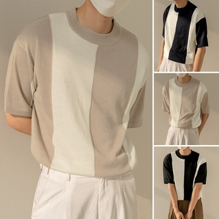 XMAN Hàn Quốc vòng cổ ngắn tay áo tông màu sắc mỏng áo thun dệt kim