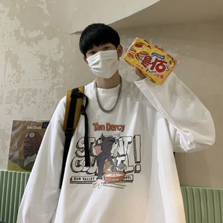 Áo thun tay dài cổ tròn dáng rộng in họa tiết hoạt hình phong cách Hàn Quốc thời trang mùa đông cho nam size M-5XL