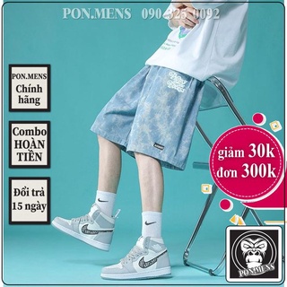 Quần đùi jean nam ống rộng lưng chun màu xanh họa tiết hoa văn 01 Pon.mens