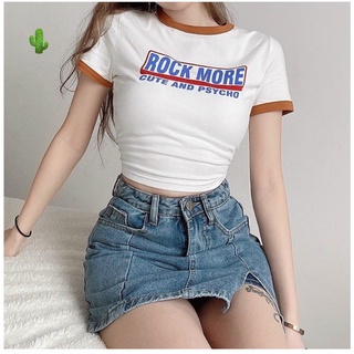 áo croptop cổ viền màu in chữ rock more pc