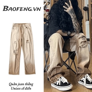 Quần Jean Nam Dài Dáng Rộng Co Giãn Tốt Phối Rách Kiểu Vintage Thời Trang Cho Nam Và Nữ Quần jean hang động retro Quần denim thẳng bình thường