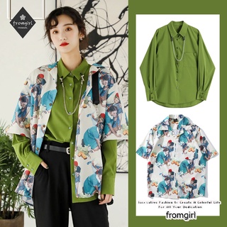 Áo Sơ Mi Cổ Tròn Tay Dài Dáng Rộng Màu Xanh Lá Thời Trang Mùa Xuân Phong Cách Retro 2022 Dành Cho Nữ
