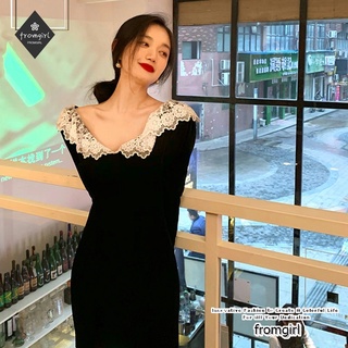 Đầm nhung đen tay dài xẻ tà phối ren quyến rũ thời trang kiểu Pháp cho nữ 2021