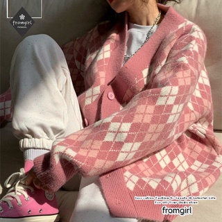 Áo khoác cardigan dệt kim cổ chữ V tay dài dáng rộng họa tiết kẻ sọc caro thời trang phong cách retro 2021