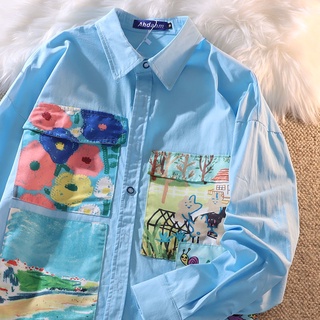 Áo Sơ Mi Dáng Rộng Phối Túi Màu Tương Phản Kiểu Retro Pháp Dễ Phối Đồ