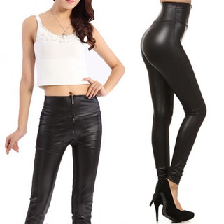 Quần legging da giả màu đen eo cao phối khóa kéo gợi cảm cho nữ