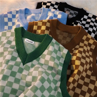 Áo len không tay dáng rộng họa tiết sọc caro thời trang Hàn quốc