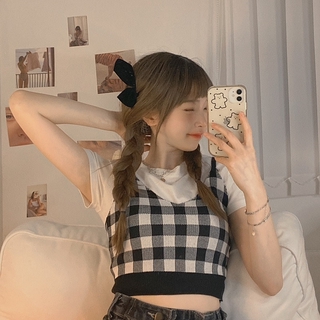 Áo Thun Dệt Kim Ngắn Tay Cổ Tròn Dáng Ôm Họa Tiết Caro Retro Cho Nữ