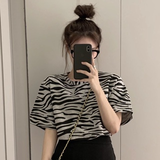 Áo Thun Ngắn Tay Dáng Rộng In Họa Tiết Ngựa Vằn Trắng Đen Phong Cách Hàn Quốc Cho Nữ