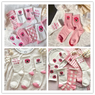 Cod Qipin INS Vớ Dài Họa Tiết Gấu Hồng Dâu Tây Hoạt Hình Phong Cách Lolita Hàn Quốc Ngọt Ngào Phụ Kiện Ngọt Ngào