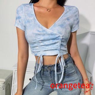 Crop Top Tay Ngắn Cổ Chữ U Phối Nơ Thời Trang