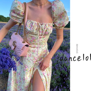 Đầm Dài Xẻ Tà Tay Ngắn Phồng In Họa Tiết Hoa Thời Trang Cho Nữ