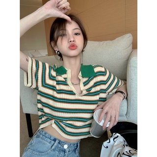 Áo Lửng Dệt Kim Cổ polo Họa Tiết Kẻ Sọc Phong Cách Retro