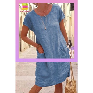 Đầm Midi Tay Ngắn Dáng Rộng Phối Túi Thời Trang Xinh Xắn Cho Nữ