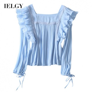 Áo chiffon IELGY dáng rộng cổ vuông tay dài phối bèo ngọt ngào phong cách Hàn Quốc