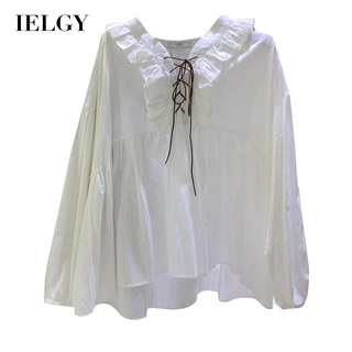 Áo sơ mi IELGY dáng rộng cổ áo viền bèo xếp nếp đan dây chéo cho nữ