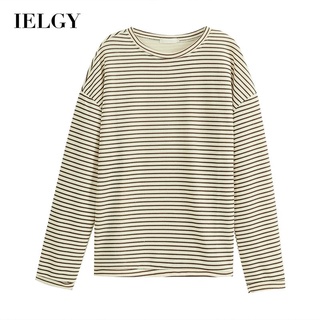 Áo IELGY cổ tròn tay dài form rộng họa tiết kẻ sọc phong cách Hàn Quốc trẻ trung cho nữ