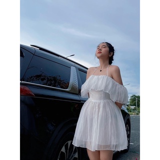 ĐẦM TRẮNG 2 DÂY NƠ XẾP LI PHỐI ÁO CROTOP CỔ TRỤ