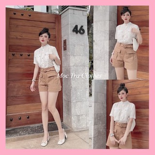 Set đồ nữ siêu xinh MALY SET gồm áo trắng cổ trụ và quần short nâu kèm đai, set bộ nữ trẻ trung sang trọng
