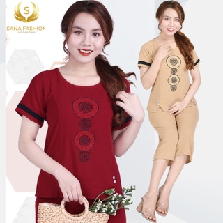 Đồ Bộ Trung Niên Ống Rộng Lững Quần Áo Cho Mẹ Mặc Ở Nhà Thêu Đồng Tiền Vải Đũi Mịn Mát DT01
