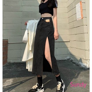 Chân Váy Denim Chữ A Lưng Cao Xẻ Tà Phong Cách Hàn Quốc