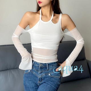 Áo Croptop Trễ Vai Tay Dài Phối Lưới Màu Trơn Thời Trang Xuân Hè Cho Nữ