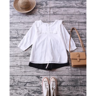 ÁO TRẮNG KẺ SỌC PHỐI VẠT CỔ ÁO RỘNG VIỀN REN