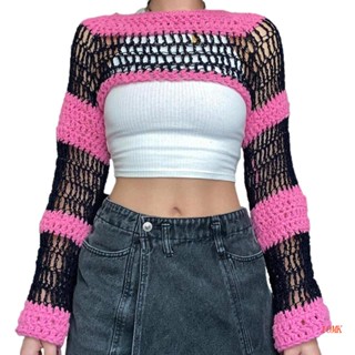 Xiangbao Áo Sweater Crop Top Dệt Kim Tay Dài Màu Sắc Tương Phản Đan Móc Hình Sọc Rỗng Cho Nữ C