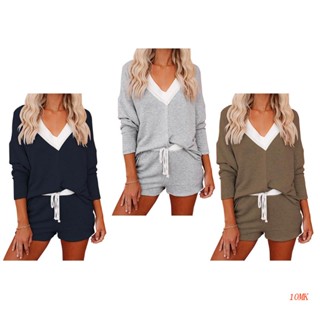 Bộ Đồ Ngủ 2 Món Tay Dài Cổ Chữ V Phối Dây Rút Màu Sắc Tương Phản Thời Trang Mùa Thu Cho Nữ