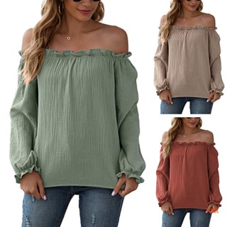 Áo Thun Tay Dài Cổ Tròn Hở Vai Dáng Rộng Màu Khối Thời Trang Quyến Rũ Cho Nữ