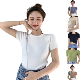 Áo Thun Croptop Dệt Kim Tay Ngắn Cổ Tròn Màu Sắc Kẹo Ngọt Xinh Xắn Dành Cho Nữ