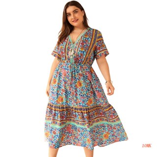 Xiangbao Plus Size Đầm Midi Tay Ngắn Cổ Chữ V In Hoa Phối Dây Buộc Phong Cách BOHO Kỳ Nghỉ Cho Nữ