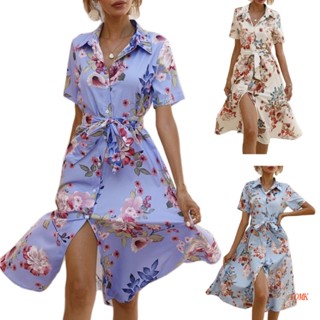 Đầm Midi Dáng Chữ A Tay Ngắn Họa Tiết Hoa Thiết Kế Xẻ Tà Phối Nút Thắt Thời Trang Cho Nữ