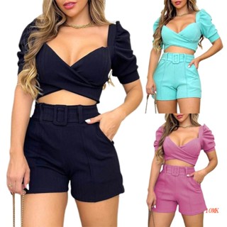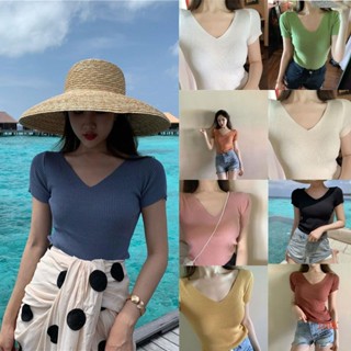 Áo Croptop Dệt Kim Tay Ngắn Cổ Chữ V Màu Sắc Đơn Giản Thời Trang Mùa Hè Quyến Rũ Cho Nữ