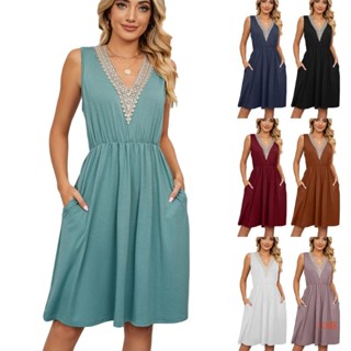 Xiangbao Đầm Midi Không Tay Cổ Chữ V Eo Thun Phối Ren Có Túi Dành Cho Nữ