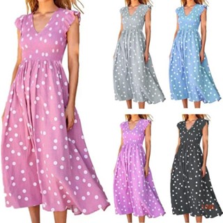 Đầm Dự Tiệc Cổ Chữ V Tay Bèo Họa Tiết Chấm Bi Thời Trang Mùa Hè Cho Nữ