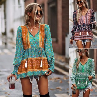 Áo Kiểu Tay Phồng Dài Dáng Rộng Cổ Chữ V Phối Dây Rút In Hoa Thời Trang Xinh Xắn Cho Nữ