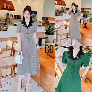 Set bộ đồ nữ áo bèo xốp caro đính cài nút mix chân váy voan dập ly sang chảnh với 2 tone màu sáng da dành cho các nàng