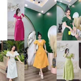 Váy đầm nữ dự tiệc dáng xòe tay phồng hở eo xoắn ngực