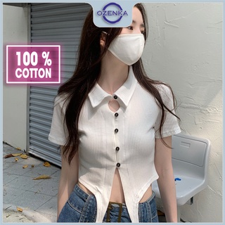 Áo croptop polo cổ bẻ tay ngắn ôm nữ OZENKA , áo crt kiểu hàn quốc khoét ngực đính nút gợi cảm 100% cotton đen trắng