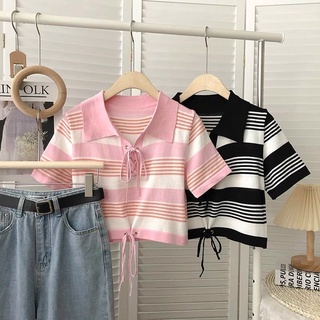 Áo len polo kẻ dáng croptop đan dây, Áo kiểu len cổ bẻ form ngắn AL6563 - NhiNhi Shop