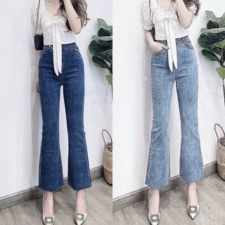Quần jean nữ ống loe trơn lai cắt co giãn, quần bò loe 9 tấc co giãn lưng siêu cao