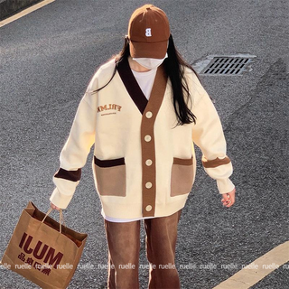 Áo Khoác Cardigan Dệt Kim Tay Dài Cổ Chữ V Dáng Rộng Thêu Chữ Phối Màu Thời Trang Vintage Dành Cho Nữ